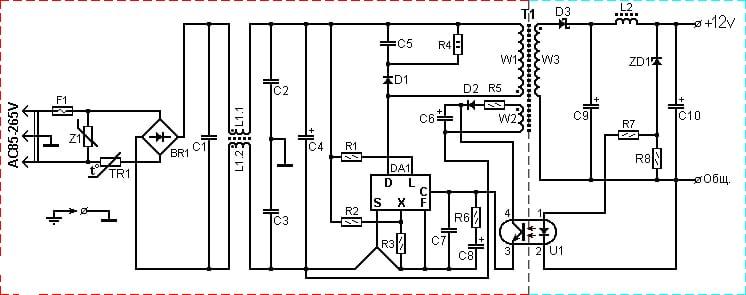 Inngangsspenningen er intermitterende, forsyner strømomformeren, bestående av en diodebro BR1 og jevner ut filteret C1-C4, L1.Det ble innhentet fra Tozi at spenningen konstant ble påført ved å forsyne DA1-mikrokretsen, toppen av denne var en høyfrekvent (opptil 100 kHz) generator, T1-pulstransformatoren var på toppen. Prinsippet for å jobbe på en transformator er å bytte katotosi til den klassiske. Den eneste forskjellen er at du jobber med et tempel for ærlighet, men det er bedre for en kamerat på en kasno måte.