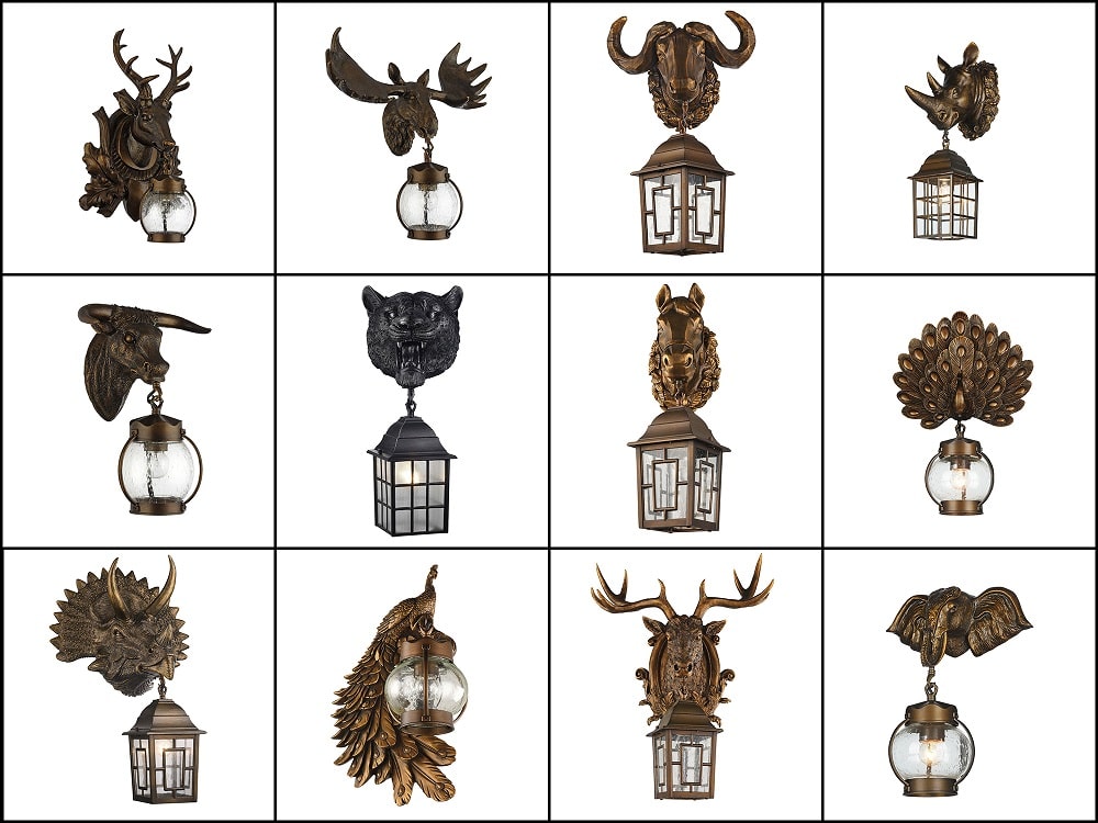 GUARDS-familien inkluderer flere: lysende modell med hvit nyanse, ekstern hengende lampe og 8 gatevegglampemodeller;